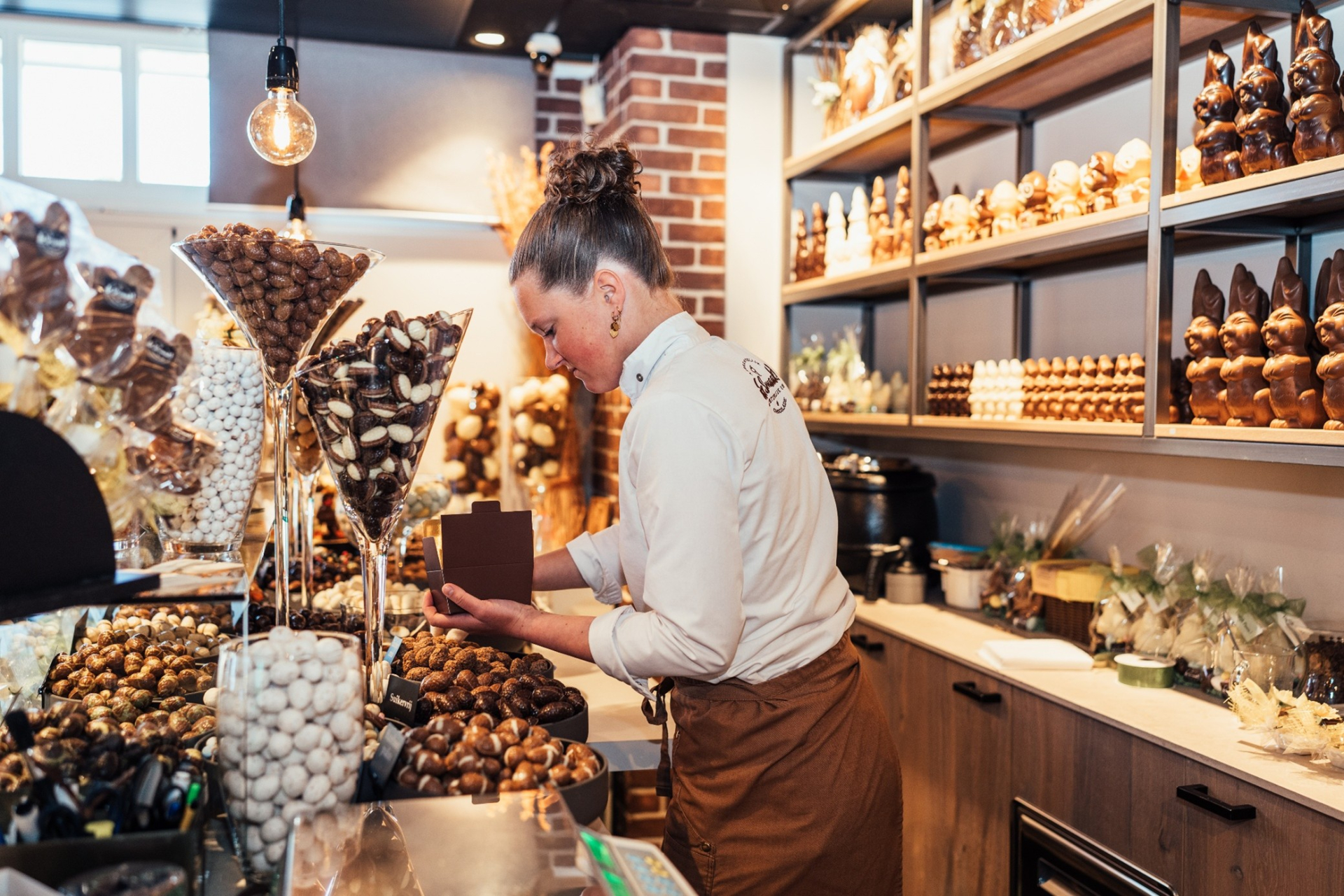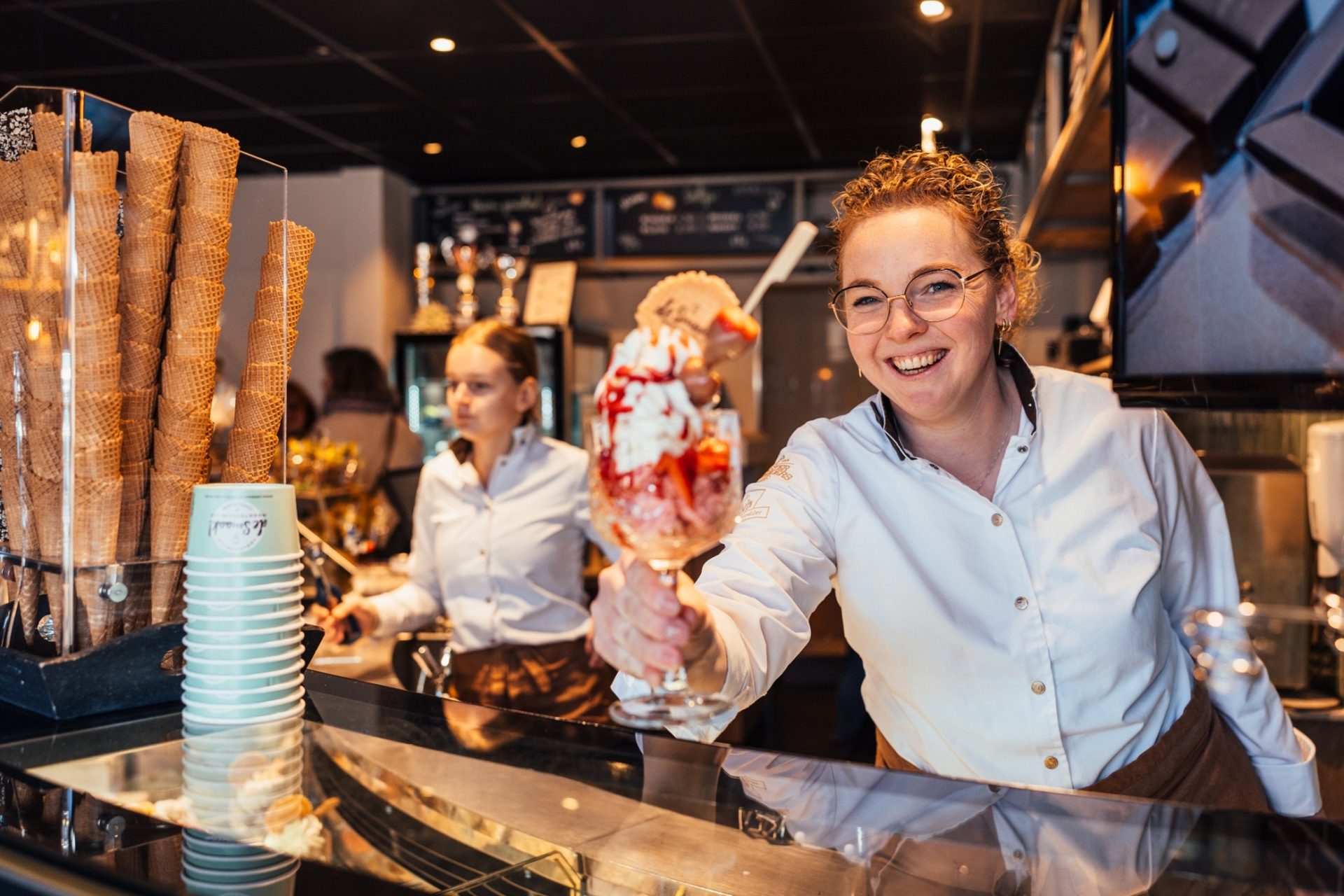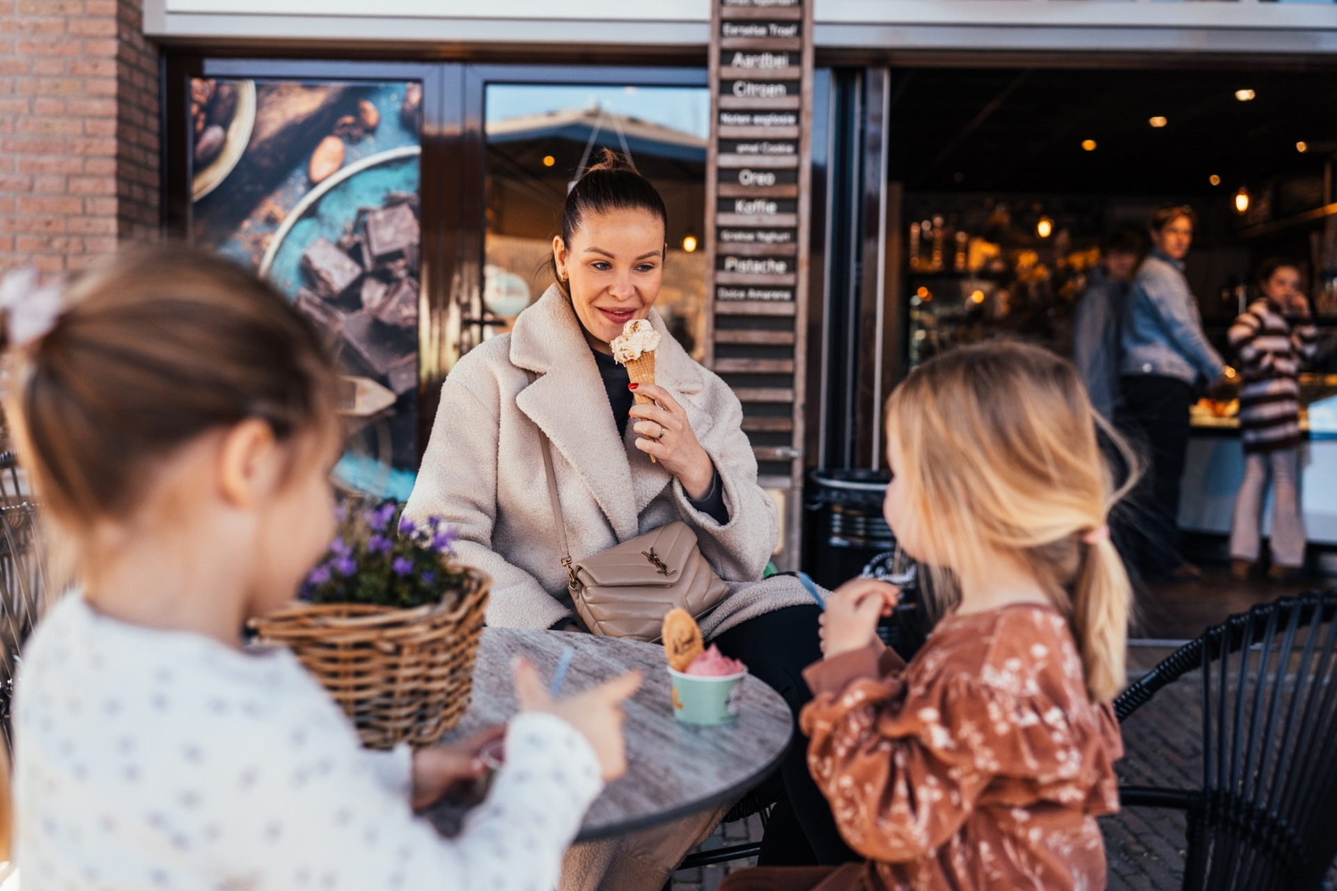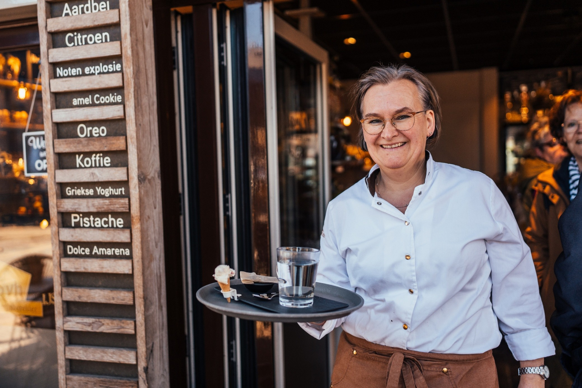 Een assortiment bestaande uit heerlijke lekkernijen chocolade. Dagelijks vers ambachtelijk schepijs. Delicatessen als nougat en heerlijke bonbons. Voor bij dit krokante, luchtige of romige lekkers, een heerlijke thee of een koffie to-go met koffiebonen van eigen melange speciaal voor u geselecteerd. Voor een milde cappuccino, een latte of een intense espresso.